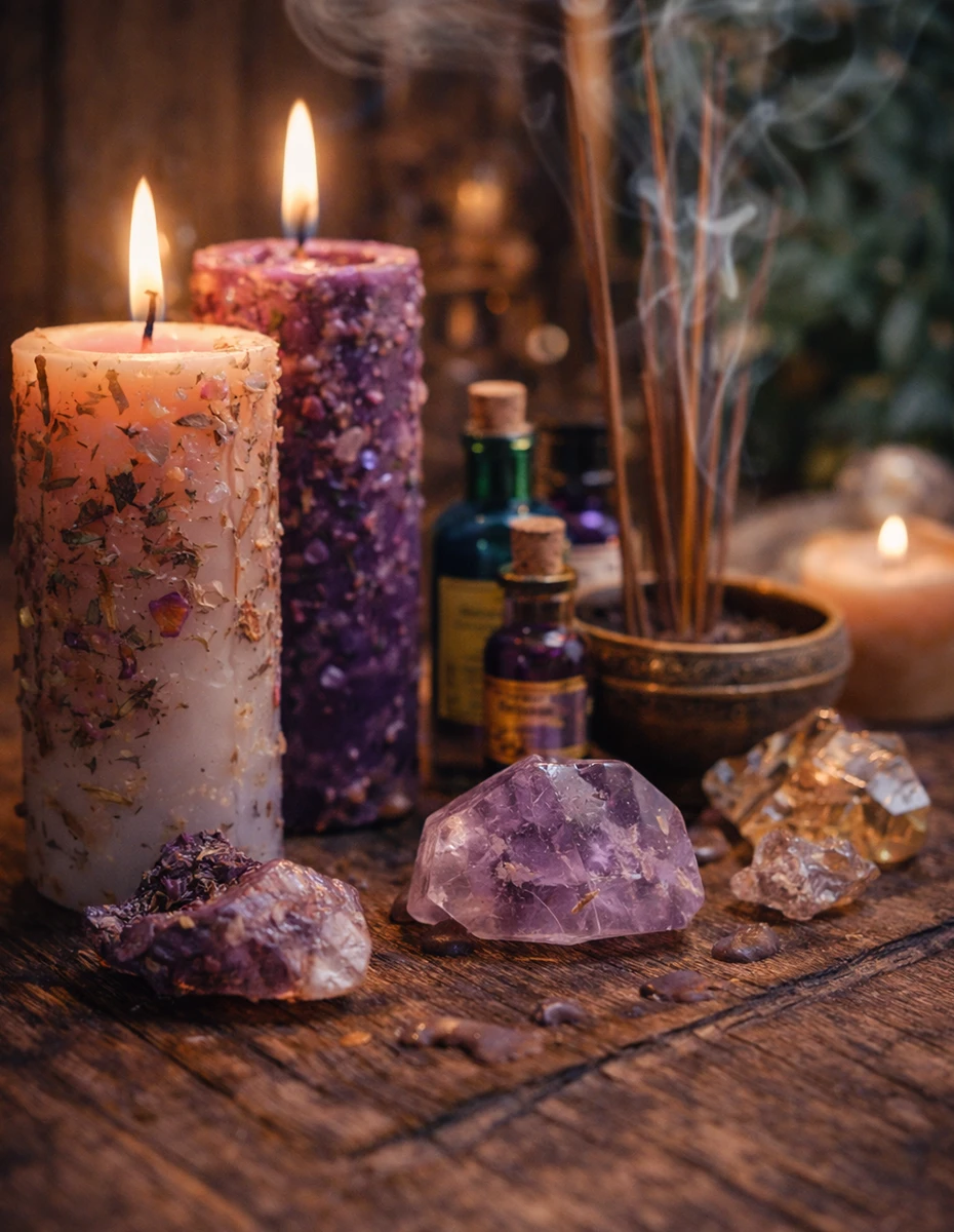 Velones, inciensos, minerales, amuletos y productos artesanales que te acompañan en tus rituales personales, en momentos de limpieza, protección, enfoque o conexión interior, integrando lo espiritual en lo cotidiano.