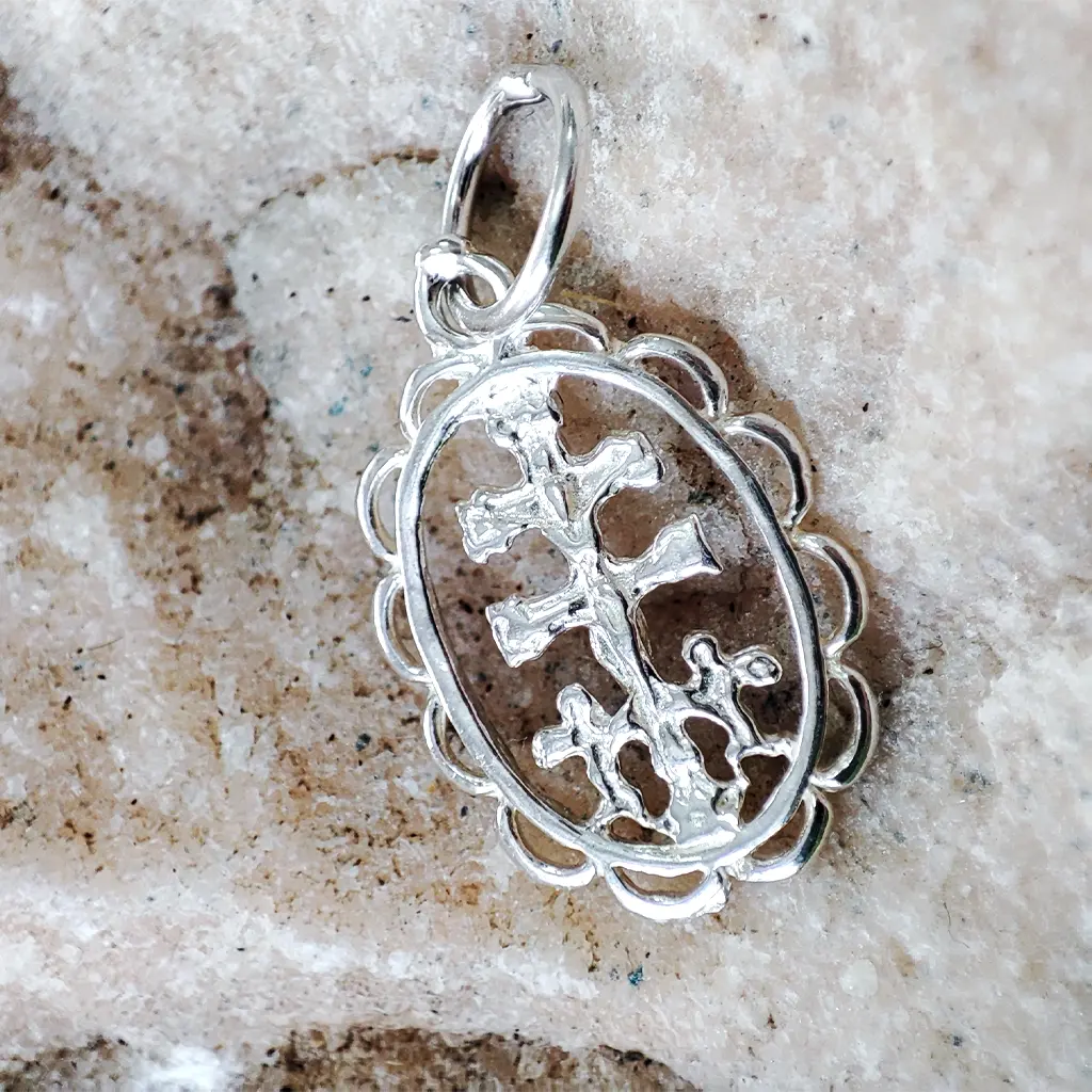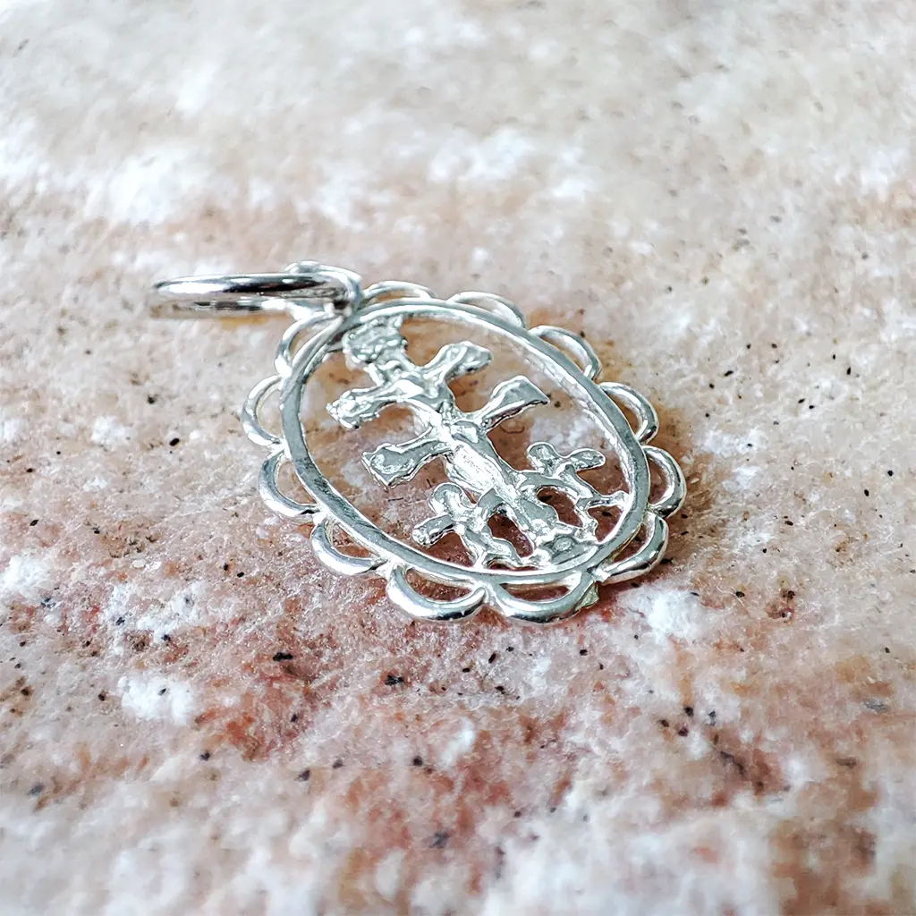 En este modelo la cruz aparece integrada dentro de un medallón ovalado calado, que enmarca el símbolo y le aporta una estética más elegante y devocional.