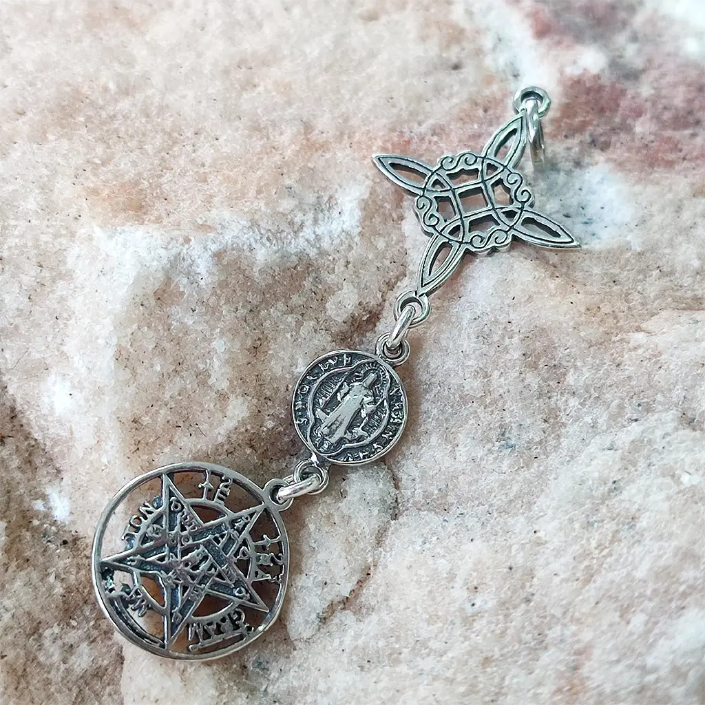 Este colgante reúne en una sola pieza tres símbolos tradicionales utilizados desde hace siglos como talismanes de protección espiritual.