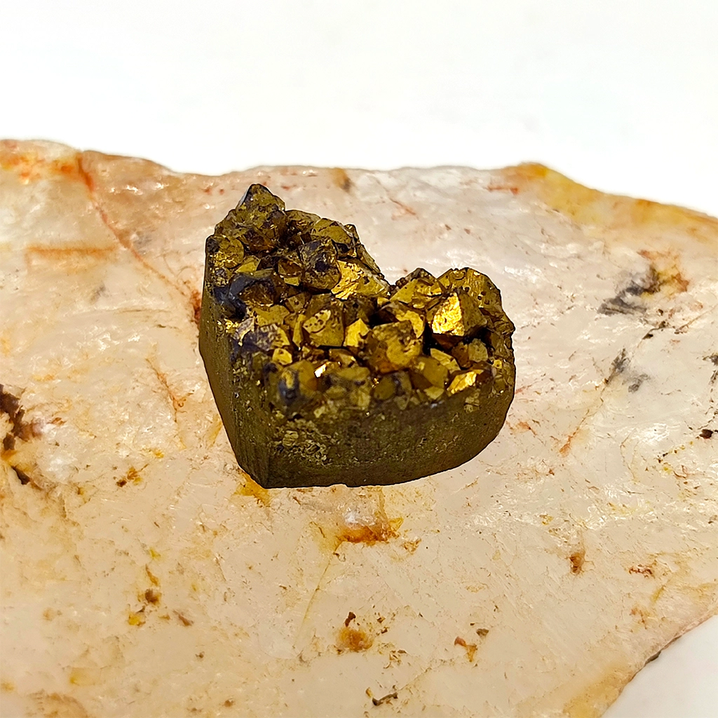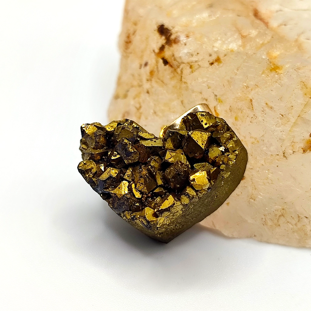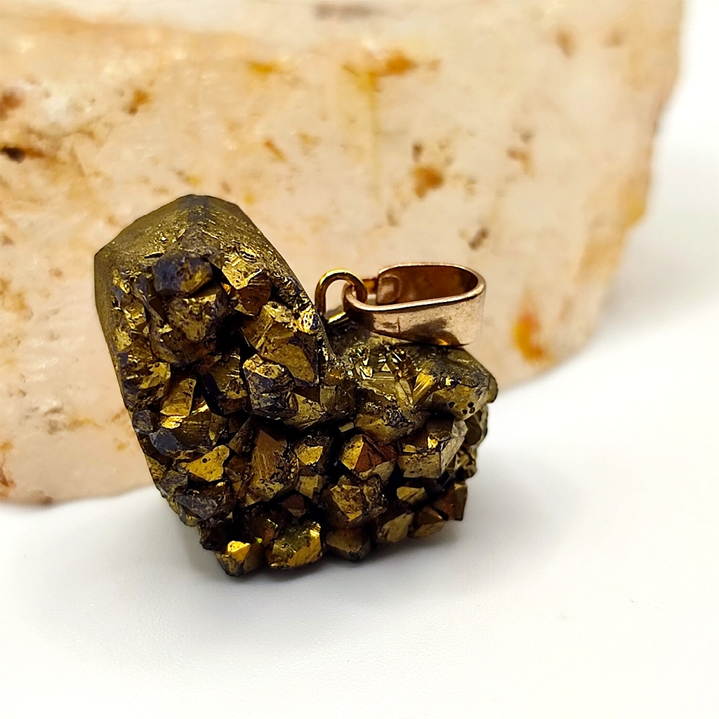 Este colgante está formado por un corazón de pirita natural en drusa, con su brillo metálico característico y su energía vibrante.