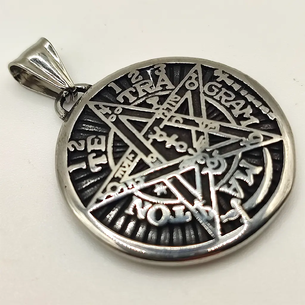 Este colgante sagrado encierra uno de los símbolos más potentes del esoterismo occidental: el Tetragrammatón. Grabado con precisión sobre acero inoxidable, representa la estrella de cinco puntas, el nombre divino, los elementos y las fuerzas universales.