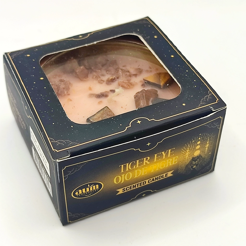 La vela Magia de Cristal Ojo de Tigre forma parte de la colección ritual Magia de Cristal de AUM, una línea de velas aromáticas elaboradas con cera vegetal y decoradas con piedras naturales.