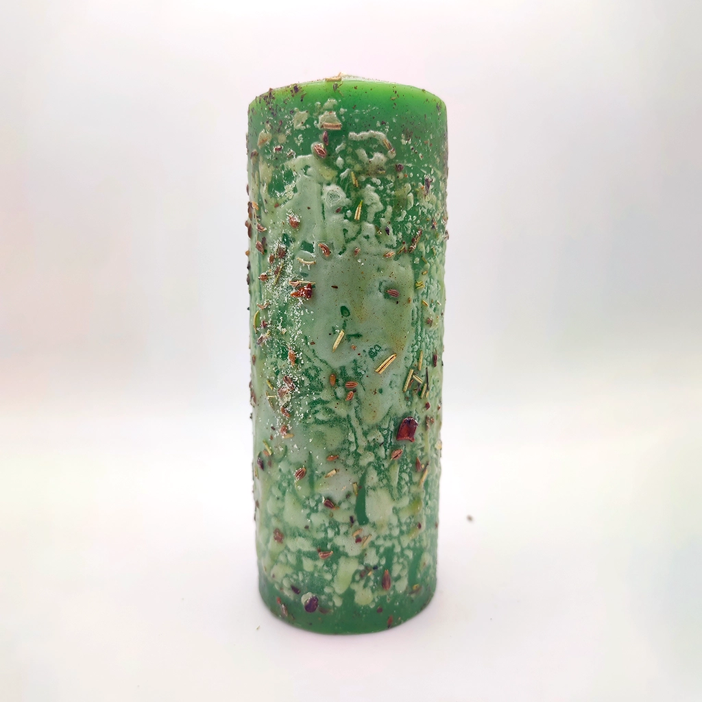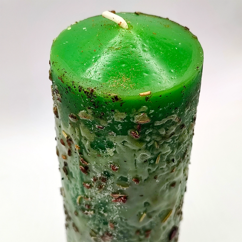 Su color verde actúa como escudo y restaurador del equilibrio, mientras que las hierbas ritualizadas trabajan la limpieza profunda, la defensa activa y el sellado del campo energético.