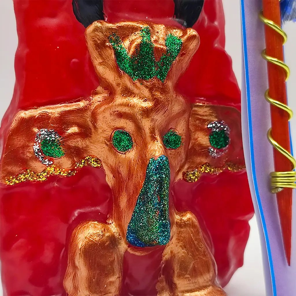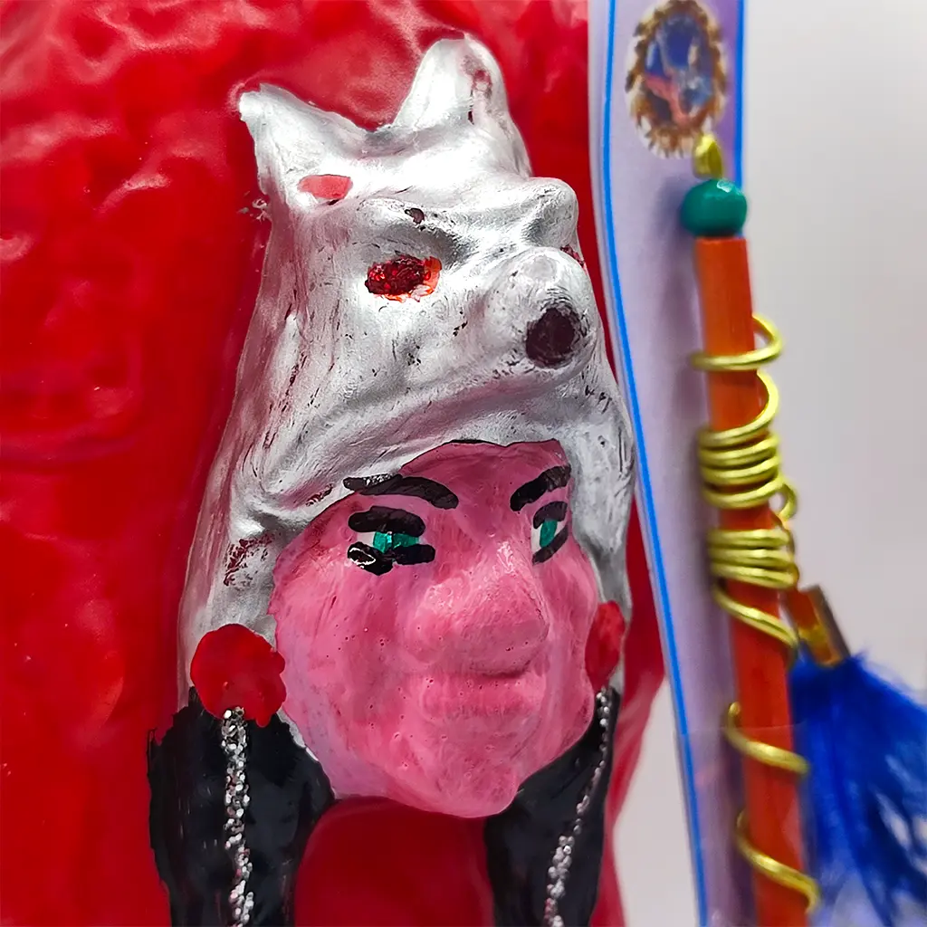 El bastón ritual que lo acompaña refuerza el simbolismo de poder espiritual, dirección energética y conexión con los planos invisibles.