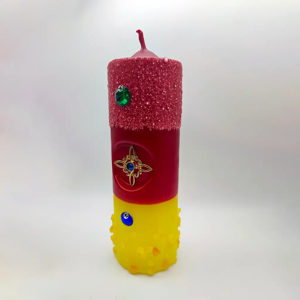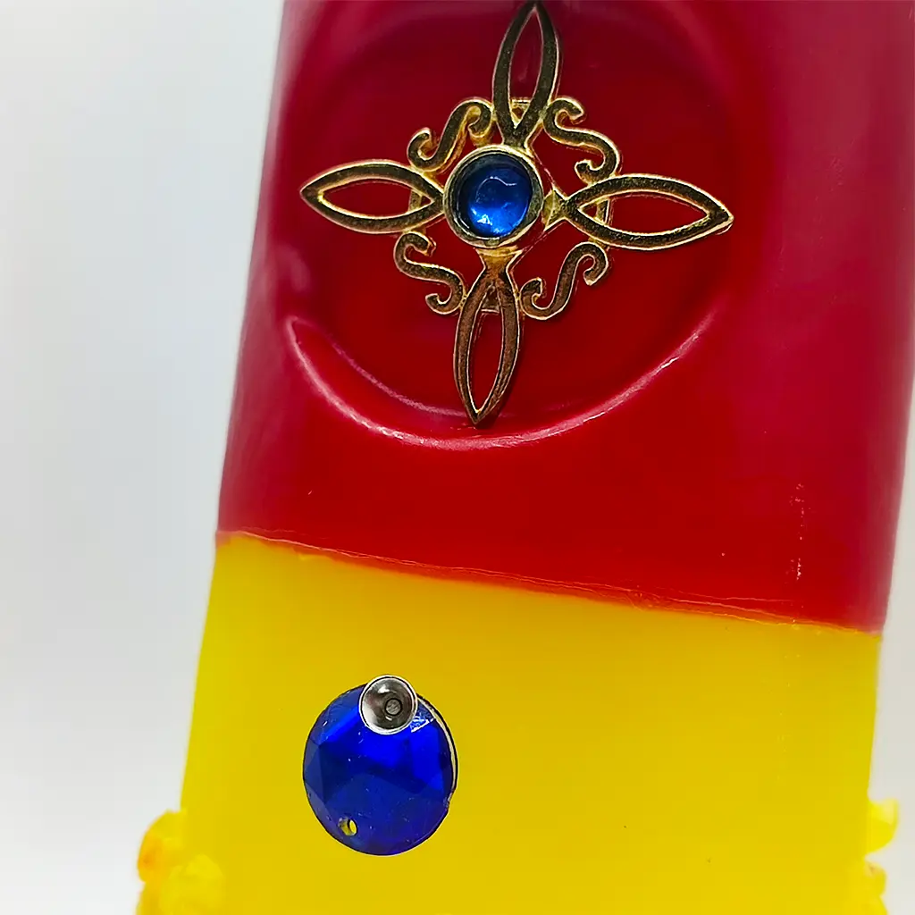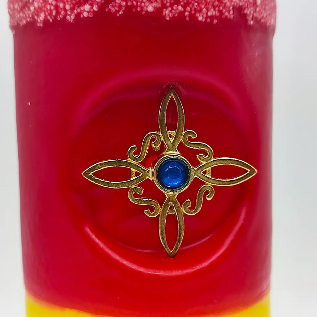 El diseño en tonos rojo y amarillo activa la energía y la voluntad, mientras que el talismán central actúa como un escudo energético permanente durante el trabajo ritual.