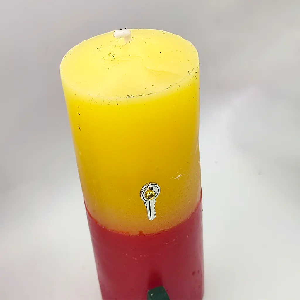 Este poderoso velón ritualizado combina los colores amarillo y rojo en un formato simbólico de desbloqueo energético. Incluye una llave metálica clavada en su cuerpo y una pastilla de incienso ritual para potenciar el trabajo mágico.