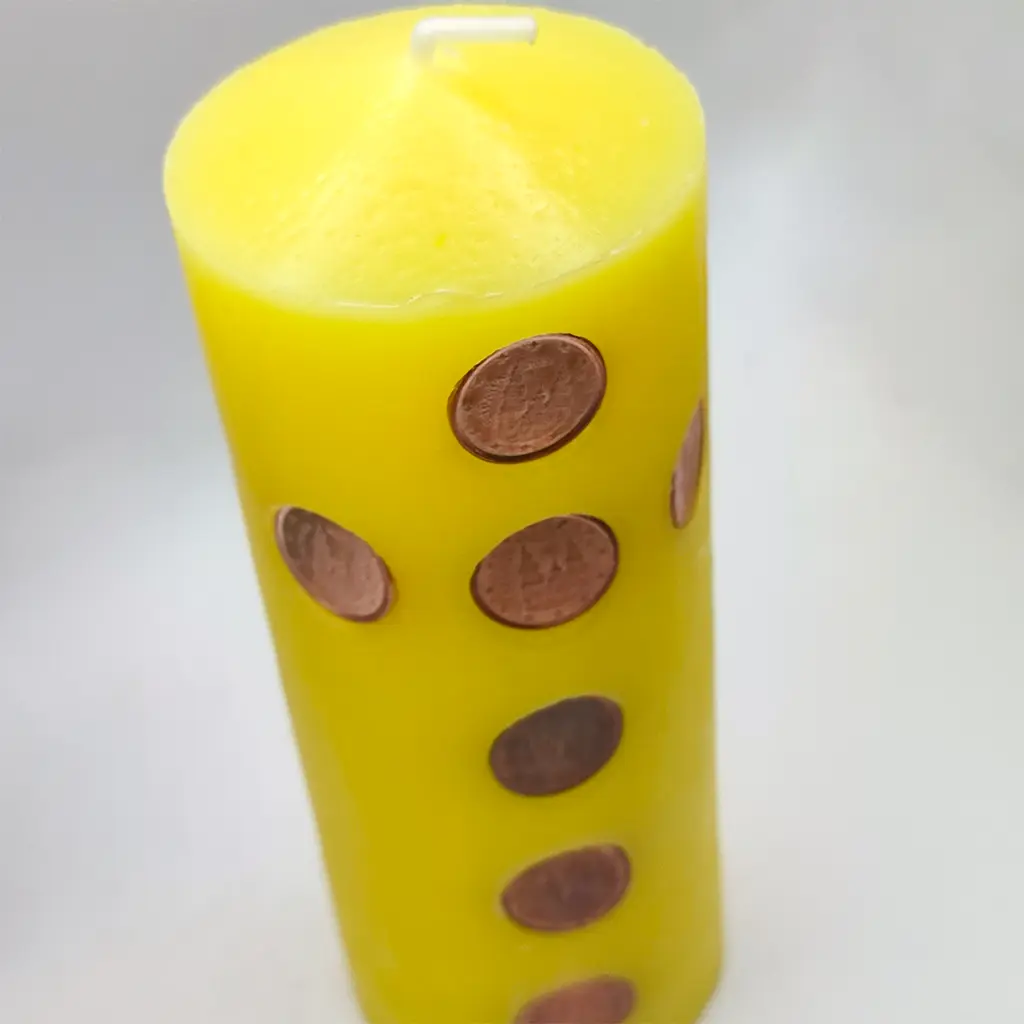 Este poderoso velón es una herramienta esotérica elaborada con cera amarilla e incrustaciones de monedas auténticas.
