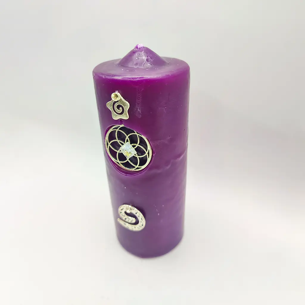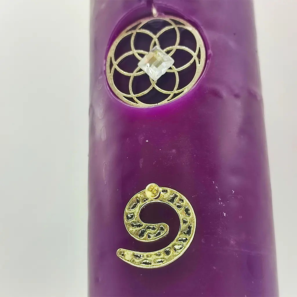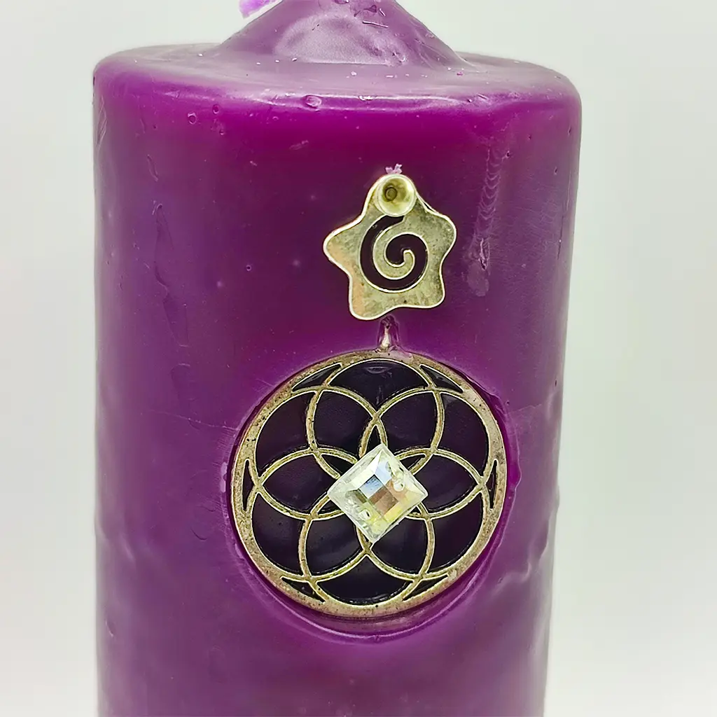 Su color púrpura y sus talismanes metálicos —la espiral, la estrella y la Flor de la Vida con piedra central— actúan como sellos vibracionales que activan un campo armónico alrededor de la persona, el hogar o el negocio.